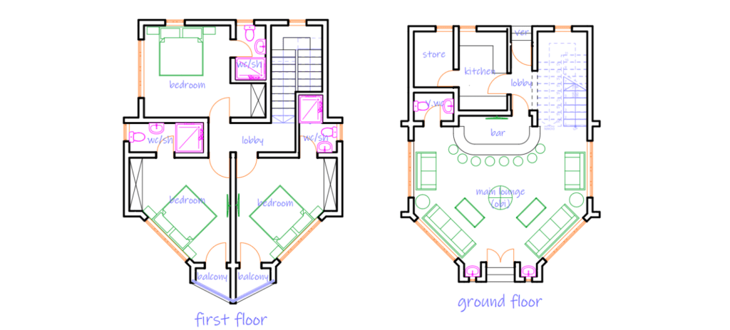 Ground Floor SpacesMain Lounge (Obi), Bar, Kitchen, Store, Lobby, Visitors’ WC, Verandah